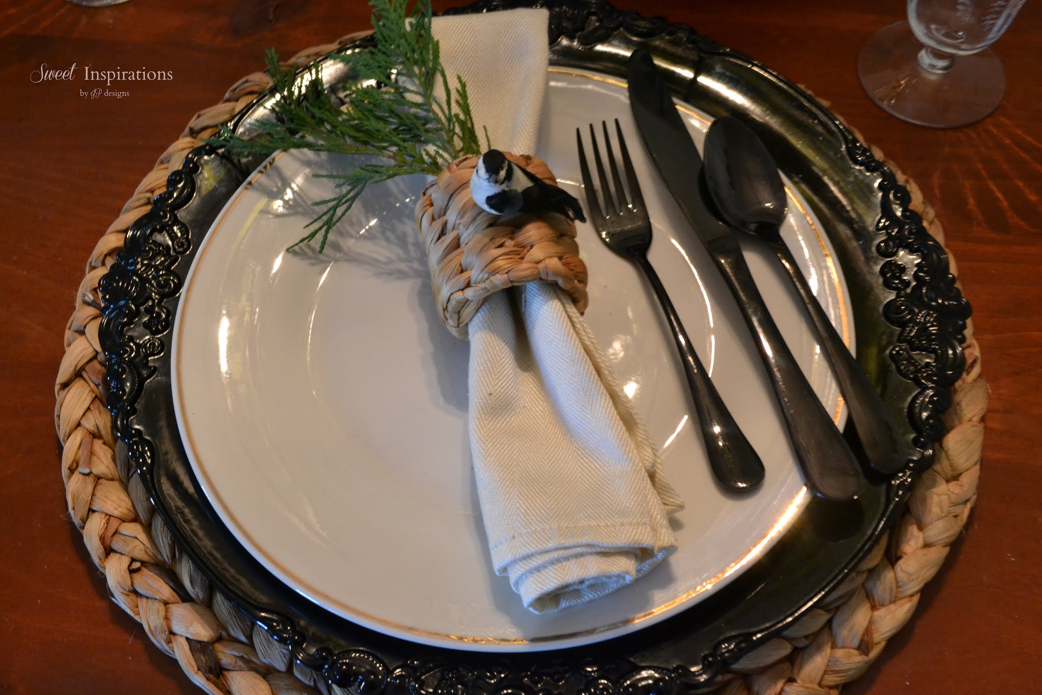 How cute are my little chickadees as accents for the theme around the table? A sprinkling of epsom salts beneath the lanterns on the saucers added a snowy base just for sparkley fun!